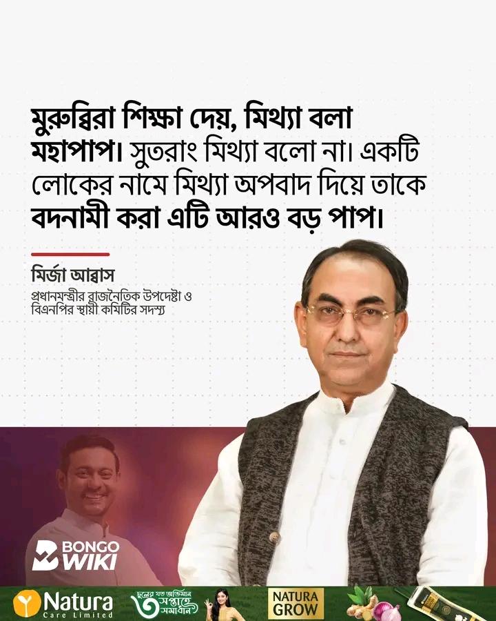 প্রধানমন্ত্রীর রাজনৈতিক উপদেষ্টা ও বিএনপির স্থায়ী কমিটির সদস্য মির্জা আব্বাস তার নির্বাচনি প্রতিদ্বন্দ্বী নাসীরুদ্দীন পাটোয়ারীসহ এনসিপি নেতাদের প্রতি ইঙ্গিত করে বলেছেন, মুরুব্বিরা শিক্ষা দেয়, মিথ্যা বলা মহাপাপ। সুতরাং মিথ্যা বলো না। একটি লোকের নামে মিথ্যা অপবাদ দিয়ে তাকে বদনাম করা এটি আরও বড় পাপ। এই পাপ থেকে দয়া করে নিজে দূরে থাকুন এবং আমাদেরকেও দূরে রাখুন।