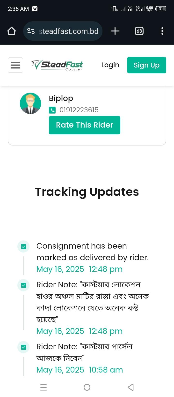 আমার কাছে Steadfast সের কুরিয়ার সার্ভিসের মাধ্যেSteadfast এর ডেলিভারি ম্যান তারা সব সময় তাড়াতাড়ি ডেলিভারি দেওয়ার চেষ্টা করে কিন্তু অনেক কাস্টমার ফোন রিসিভ করে না বিভিন্ন বাহানা করে গালাগালি করে তাই তাদের উদ্দেশ্য এ বলছি ভাই ও বোনেরা আপনারা যদি পণ্য না নেন আরেক জনের ক্ষতি করবেন ডেলিভারি চার্জ কিন্তু কোম্পানি আমাদের কাছে থেকে ঠিক নেয় কারণ তাদের ও খরচ হয় আমার কাছে Steadfast সের কুরিয়ার সার্ভিসের মাধ্যে0 Comments 0 Shares -
